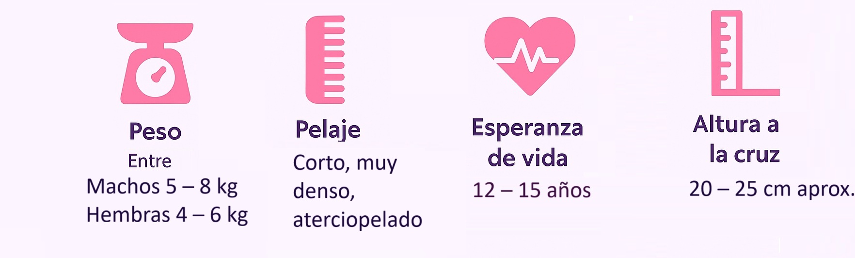 - Tamaño y peso: suelen medir entre 30 y 35 cm de altura y su peso oscila entre 4 y 6 kg en las hembras y 5 a 8 kg en los machos.