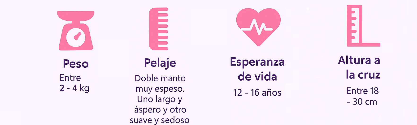 - Tamaño y peso: suelen medir entre 18 y 24 cm de altura y su peso oscila entre 2 y 3,5 kg.